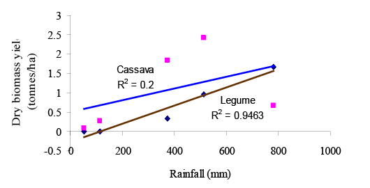 Effect of rainfall (mm) on the dry biomass yield of cassava and legume