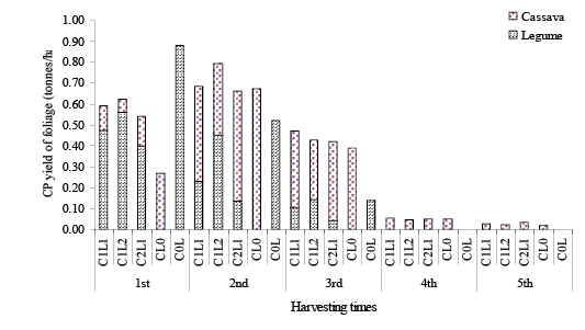 Effect of intercropping cassava and legume on CP yield of foliage (DM tonnes/ha) according to harvest frequency.
