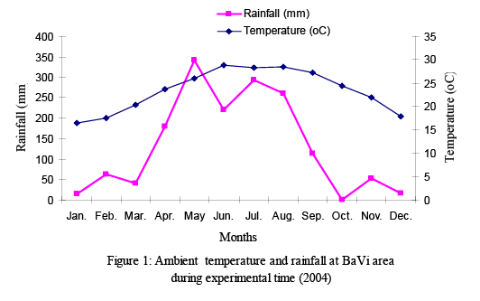 Ambient temperature and rainfall at BaVi area during experimental time (2004)