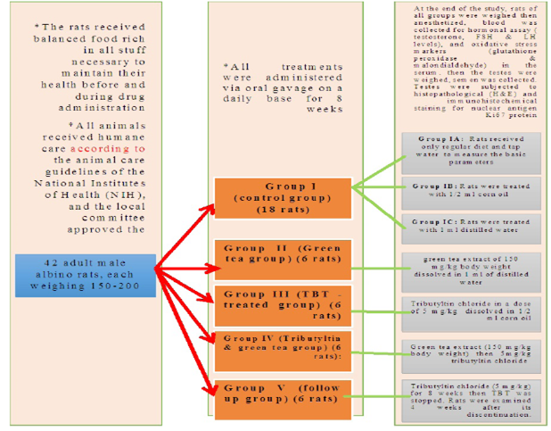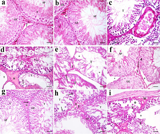 A photomicrograph of H and E stained sections of the control subgroups showing similar histological results, so the negative control group is considered as the control group. a: H and E stained sections of the control testes reveals numerous packed seminiferous tubules (T) that are lined by stratified germinal epithelium (GE). Spermatozoa (SP) are present in the lumen of seminiferous tubules. Interstitium (I) contains interstitial cells (arrow) and blood vessels (v). b: Examination of Hand E stained sections in rat testes of green tea group revealed also normal histological structure. Packed seminiferous tubules (T) that are lined by stratified germinal epithelium (GE). Spermatozoa (SP) are present in the lumen of seminiferous tubules. Interstitium (I) containing Leydig cells (arrow) is also seen; c: Sections in TBT treated group reveal marked disorganized seminiferous tubules (T). Some sections showing tubules with their germinal epithelium separated from their basal laminae (S). Germinal epithelial cells with dark pyknotic nuclei (arrow) are detected. Blood vessels (V) in the interstitium are dilated and congested; d: Other sections in TBT treated group showing seminiferous tubules (T) with a marked decrease in the epithelial height or lose their lining epithelium, other tubules had marked vacuolations (v). Acidophilic vacuolated hyaline material (H) is present in the interstitium in between the tubules; e: Sections in TBT treated group reveals shrinkage of the tubules (T) with irregular basement membrane (arrow), wide Interstitium (I), and areas of tissue loss in the lining germinal epithelium (*). f: Examination of sections in the TBT and green tea group showing improvement in the histological picture of the germinal epithelium (GE) of seminiferous tubules (T). Some spermatozoa (SP) are present in the lumen of the tubules. Separation between some tubules (*) and intracellular vacuolations (arrowhead) in some germinal epithelial cells are still detected; g: Other sections in TBT and green tea group showing normal histological structure. Tubules (T) are lined by germinal epithelium (GE). Spermatozoa (SP) are present in the lumen of the tubules. Interstitium (I) containing Leydig cells (arrow) and blood vessels (BL) is also detected; h: Sections in the follow-up group showing tubules (T) lined by germinal epithelial cells (GE), most of them had dark pyknotic nuclei (arrow). Interstitium (I) reveals hyaline (H) vacuolated material (V); i: Other sections in the follow-up group showing, disorganized tubules (T), congested blood vessels (BL), and marked cellular loss (*). H and E× 400 (scale bar 20µm).