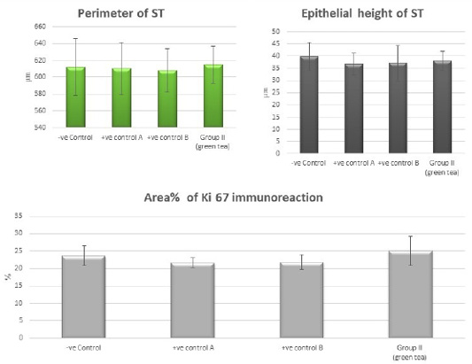Bar charts showing the comparative magnitude of mean values of the perimeter of ST, the epithelial height of ST and area% of Ki 67 immunoreaction among the negative control group, positive control A (Corn oil group), positive control B (Distilled water group) and Green tea group (II).
