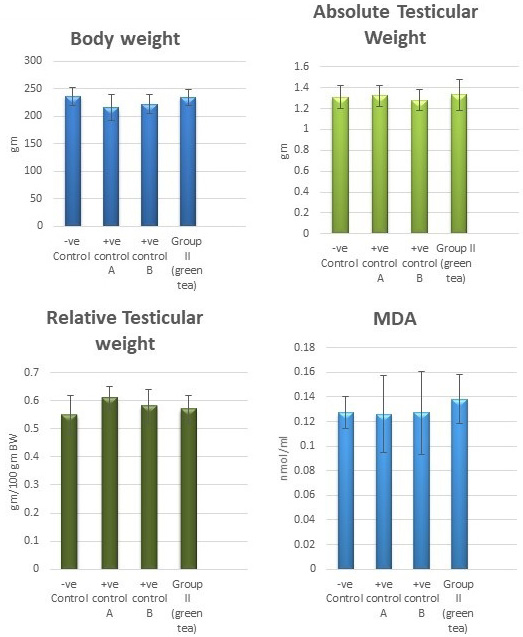 Bar charts showing the comparative magnitude of mean values of the body weight, testicular weight, relative testicular weight and MDA among the negative control group, positive control A (Corn oil group), positive control B (Distilled water group) and Green tea group (II).