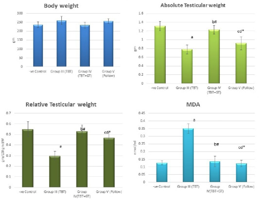 Bar charts showing the comparative magnitude of mean values of the body weight, absolute testicular weight, relative testicular weight and MDA among the negative control group (I), TBT treated group (III), TBT and green tea group (IV) and follow up group (V).