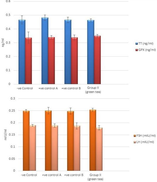 Bar charts showing the comparative magnitude of mean values of testosterone, GPX, FSH, and LH levels among the negative control group, positive control A (Corn oil group), positive control B (Distilled water group) and Green tea group (II).