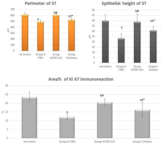 Bar charts showing the comparative magnitude of mean values of the perimeter of ST, the epithelial height of ST and area% of Ki 67 immunoreaction among the negative control group (I), TBT treated group (III), TBT and green tea group (IV) and follow up group (V).