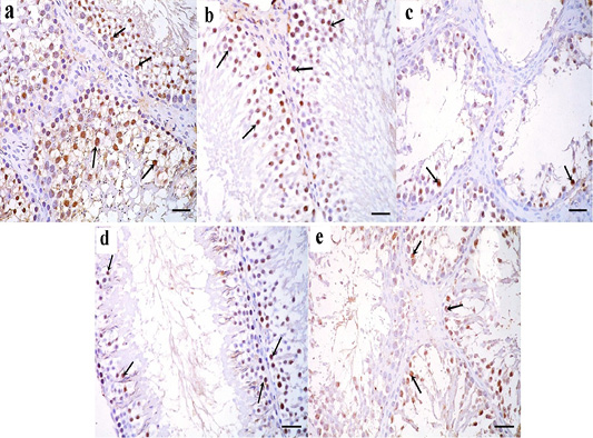 a: Immunohistochemical reaction for ki67 stained sections in the testicular tissue of the control group showing a strong positive reaction in the nuclei of germinal epithelial cells (arrow); b: Immunoperoxidase technique for ki67 in green tea treated group showing a strong positive reaction in the nuclei of germinal epithelial cells (arrow); c: In TBT treated group, a positive reaction for ki67 in the nuclei of few germinal epithelial cells is seen (arrow); d: TBT and green tea treated group reveals strong positive reaction in the nuclei of most of the germinal epithelial cells (arrow); e: In the follow-up group, a strong positive reaction is seen in the nuclei of some germinal epithelial cells (arrow). Immunoperoxidase technique× 400 (scale bar 20µm).