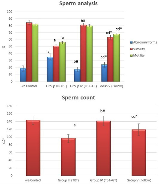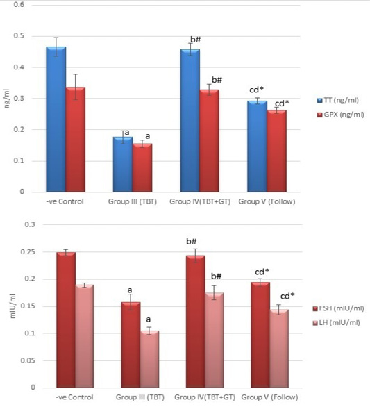 #p>0.05, *p<0.05, ap<0.001 compared to control group, bp<0.001, cp<0.05 compared to TBT group, dp<0.05 compared to TBT +GT group. Values are presented as mean ± SD (n= 6 in each group).
