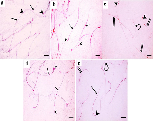 a: A photomicrograph of sperms from the control rats showing normal morphology with normal heads (arrowheads) and normal tails (arrows); b: In green tea treated group, normal sperm morphology is detected. Sperms have smooth heads with hooked tapering apex (arrowhead) and normal long tails (arrow); c: In TBT treated group, sperm abnormalities are detected in the heads and tails; curved sperms (curved arrow), headless tails (double arrow), and abnormally shaped heads (arrowhead) are seen; d: In TBT and green tea treated group, marked improvement in sperm morphology as the sperms are with normal heads (arrowhead) and tails (arrow). e: In the follow-up group, some sperms are with normal heads (arrowhead) and tails (arrow), however, others still have abnormalities such as headless tails (double arrow) and curved sperms (curved arrow). Eosin-nigrosin X 400 (scale bar 20µm).