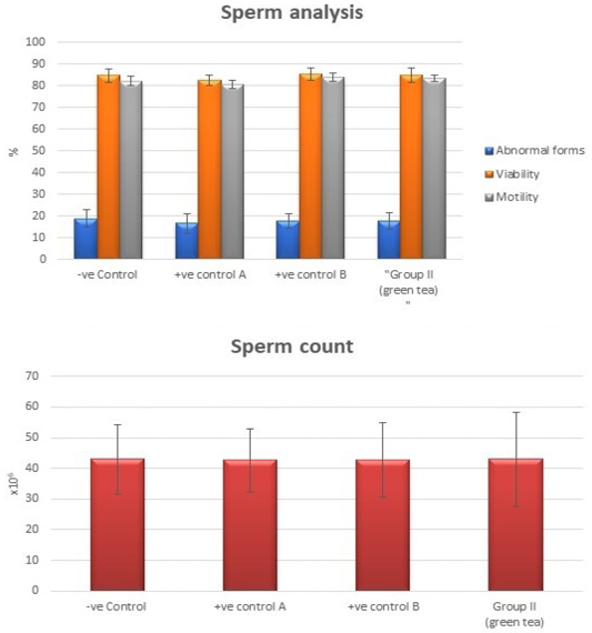 Bar charts showing the comparative magnitude of mean values of sperm count, abnormal forms, sperm motility, and sperm viability among negative control group, positive control A (Corn oil group), positive control B (Distilled water group) and Green tea group (II).