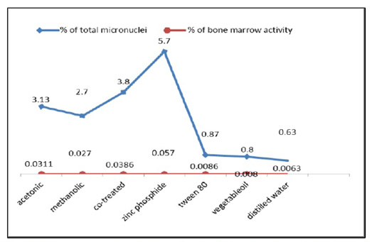 The frequency percentages of micronucleated polychromatic erythrocytes (MNPCEs) and the bone marrow activity from the bone marrow cells of control and treated animals.