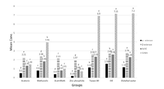α –esterase (µg phenol/ml), β-esterase (µg phenol/ml), AchE (ng/ml) and GABA (mumol/L) in tested extracts and zinc phosphide compared to control groups.