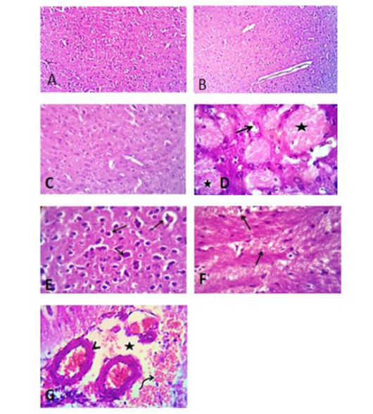 Photomicrograph of brain section of control groups treated with tween 80, vegetable oil and distilled water for 28 days showing apparently normal brain tissue (A), (B) and (C), H&E. X 100. (D) Photomicrograph of brain section of group treated with acetonic extract of H. curassavicum at dose (625 mg/kg b.wt.) for 28 days, revealed focal neuronal degeneration (open arrow) and coagulative necrosis of some axons (stars). (E) Photomicrograph of brain section of group treated with methanolic extract of H. curassavicum at dose (825 mg/kg b.wt.) for 28 days, showed Perivascular and perineural edema beside degeneration of moderate number of neurons in the cerebral cortex (arrows). (F) Photomicrograph of brain section of group treated with both acetonic and methanolic extracts of H. curassavicum at dose (625 and 825 mg/kg b.wt.), respectively for 28 days revealed perivascular edema, focal gliosis (open arrow) beside axonal degeneration and demylination (closed arrows). (G) Photomicrograph of brain section of group treated with zinc phosphide at dose (5 mg/kg b.wt.) for 28 days, showing perivascular edema (stars) and hemorrhage (curved arrow). The lateral ventricles showing dilatation with edema and congestion of the choroid plexuses (arrow heads). H&E. X 400.