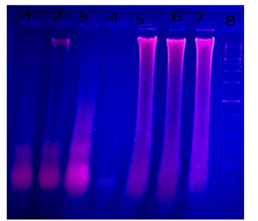 DNA fragmentation in liver of male albino rats orally administrated with H. curassavicum acetonic, methanolic, mixture of both extracts once daily at dose (625 and 825 mg/kg b.wt.), respectively and zinc phosphide at dose (5 mg/kg b.wt.) for 28 days. Lane 1: group treated with acetonic extract. Lane 2: group treated with methanolic extract. Lane 3: co-treated group. Lane 4: group treated with zinc phosphide. Lane 5: control group treated with tween 80, Lane 6: control group treated with vegetable oil, Lane 7: control group treated with distilled water. Lane 8: ladder.
