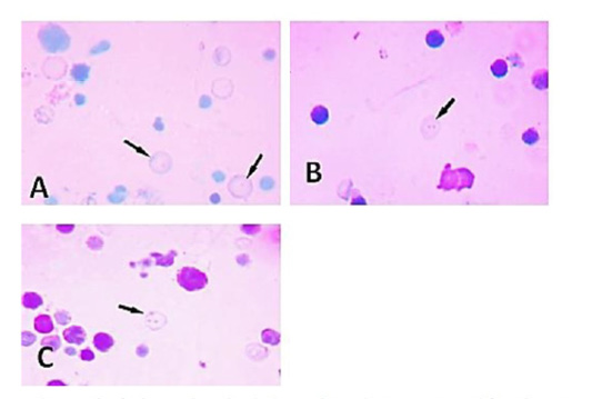 A micrograph of micronucleated polychromatic erythrocytes prepared from bone marrow cells of adult male rats treated showing variation in their number: (A) Single micronucleus. (B) Bi-micronuclei. (C) Multi-micronuclei.