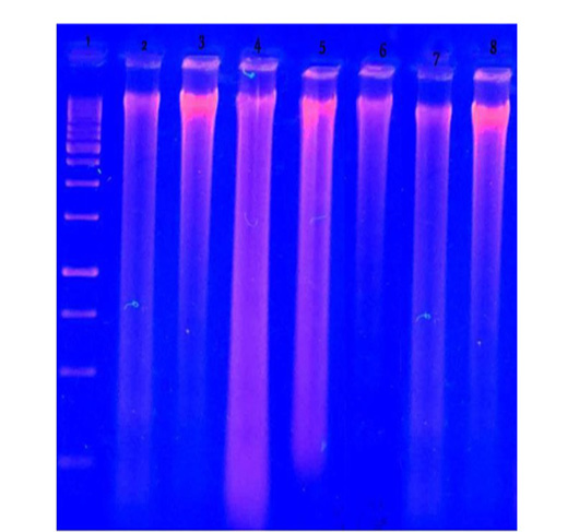 DNA fragmentation in brain of male albino rats orally administrated with H. curassavicum acetonic, methanolic, mixture of both extracts once daily at dose (625 and 825 mg/kg b.wt.) respectively and zinc phosphide at dose (5 mg/kg b.wt.) for 28 days. Lane 1: ladder. Lane 2: group treated with acetonic extract. Lane 3: group treated with methanolic extract. Lane 4: co-treated group. Lane 5: group treated with zinc phosphide. Lane 6: control group treated with tween 80. Lane 7: control group treated with vegetable oil. Lane 8: control group treated with distilled water.