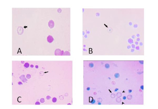 A micrograph of micronucleated polychromatic erythrocytes prepared from bone marrow cells of adult male rats treated showing variation in their number (A) Almond shape (B) Rounded mass. (C) Rod-like structure. (D) Dot-like structure
