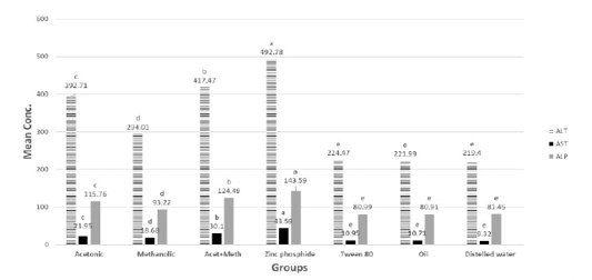 ALT (U/ml), AST (U/ml) and ALP (U/ml) in tested extracts and zinc phosphide compared to control groups.