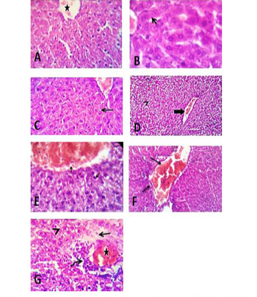 Liver sections of control group of tween 80 (A), vegetable oil (B) and distilled water (C) showing normal histological structure. (D) Photomicrograph of liver section of group treated with acetonic extract of H. curassavicum at dose (625 mg/kg b.wt.) for 28 days, revealed mild congestion of hepatic blood vessels (thick arrow) and degenerative changes in moderate number of hepatocytes (arrow head). (E) Photomicrograph of liver section of group treated with methanolic extract of H. curassavicum at dose (825 mg/kg b.wt.) for 28 days, showed congestion of hepatic blood vessels and degenerative changes in a moderate number of hepatocytes (arrows). (F) Photomicrograph of liver section of group treated with both acetonic and methanolic extracts of H. curassavicum at dose (625 and 825 mg/kg b.wt.), respectively for 28 days revealed severely congested portal blood vessels, portal lymphocytic infiltration and biliary hyperplasia (arrows). (G) Photomicrograph of liver section of group treated with zinc phosphide at dose (5 mg/kg b.wt.) for 28 days, showed moderate congestion of the hepatic blood vessels (stars), perivascular edema (arrow), round cells infiltration (curved arrow) and hydropic degeneration in large number of hepatocytes (arrow head). H&E. X 400.
