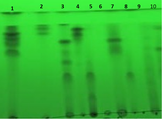 Separation of extracellular secondary metabolites on TLC plate under short wavelength UV light. Where, the numbers from 1 to 10 are the numbers of fungi in the Table 1.