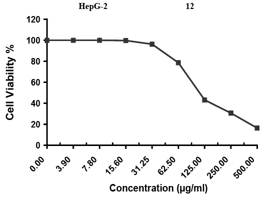 Evaluation of cytotoxicity against HepG-2 cell line; Inhibitory activity against Hepatocellular carcinoma cells was detected under these experimental conditions with IC50 = 113 ± 3.7 µg/ml.