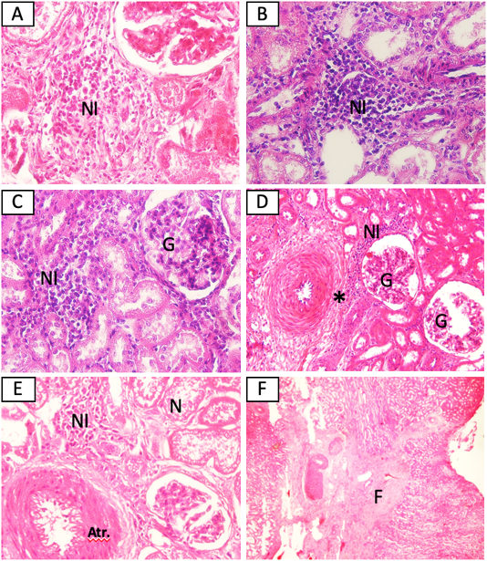 Histopathological changes of kidney from cattle positive with leptospirosis. (A) Sample SPG2, (B) Sample SPG6, (C) Sample SPG7, (D) sample SPG12, (E) Sample SPG16, (F) sample SPG18. NI: Interstitial nephritis, G: glomerulonephritis, *: perivasculitis, N: nephrosis, Atr.: atherosclerosis. H and E (A, B, C, E 40x), (D 20x), (F 4x).