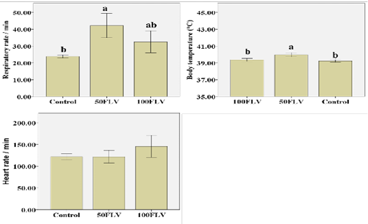 Overall mean of Clinical parameters (Mean ± SE) after intravenous LPS infusion and in all experimental groups. Different letters indicate significant difference among groups (P ≤ 0.05)