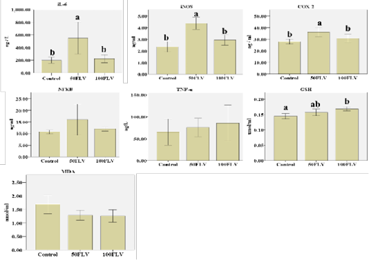 Overall mean of IL-6, I NOS, COX-2, NF-kB, TNF-α, GSH and MDA (Mean ± SE) after intravenous LPS infusion and in all experimental groups. Different letters indicate significant difference among groups (P ≤ 0.05).