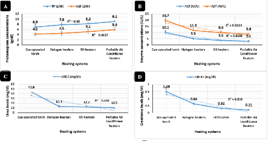 Biochemical profile in broilers reared in different heating systems. Proteinogram serum concentrations (g/dl) in broilers reared in different heating systems. Liver and muscle enzymes concentrations (IU/L) in broilers reared in different heating systems. Urea serum concentrations (mg/dl). Creatinine serum concentrations (mg/dl)