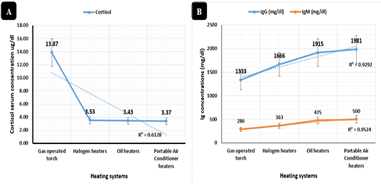 Sera stress marker (µg/dl) and immunoglobulin concentrations (mg/dl). Cortisol serum concentrations (µg/dl) in broilers reared in different heating systems. B) Immunoglobulin (IgG and IgM) serum concentrations (mg/dl) in broilers reared in different heating systems.