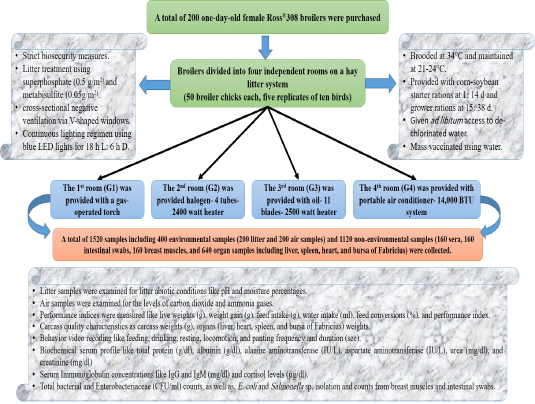 Representative experimental design with broilers receiving, housing system, management, grouping according to treatments, sampling, and measurements.