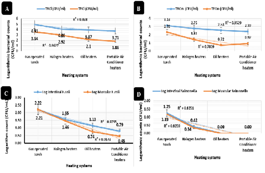 Bacterial counts and isolation (CFU/mL). Total bacterial counts of intestinal swabs (TBCi) expressed by CFU/ml, Total Enterobacteriaceae counts of intestinal swabs (TECi) expressed by CFU/ml.Total bacterial count of breast muscles (TBCm) expressed by CFU/ml and Total Enterobacteriaceae counts of breast muscles (TECm) expressed by CFU/ml. E. coli isolation and counts (CFU/ml) from intestinal swabs and breast muscles of broilers reared in different heating systems. Salmonella isolation and counts (CFU/ml) from intestinal swabs and breast muscles of broilers reared in different heating systems.