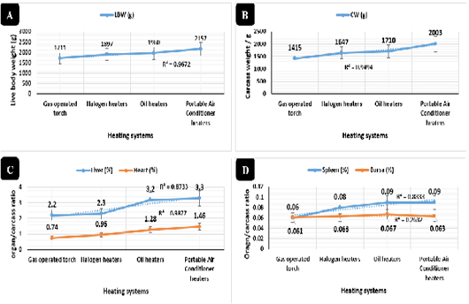 Live and carcass weights and immune organs’ ratio in broilers reared in different heating systems. Live marketing body weight (g) in broilers reared in different heating systems. Carcass weight (g) in broilers reared in different heating systems. Liver and heart to carcass ratio (%) in broilers reared in different heating systems. D) Bursa and Spleen to carcass ratio (%) in broilers reared in different heating systems.