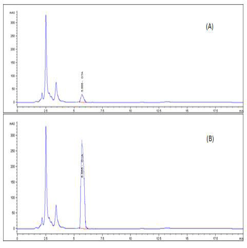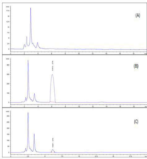HPLC chromatogram of OTA residues in breast muscle sample (A) Control muscle sample (B) Positive OTA muscle sample (C) Positive OTA- and anti-mycotoxin-treated muscle sample.
