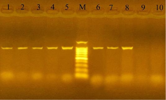 PCR for detection of Rpt2 gene in M. haemolytica isolates at amplicon size 1022 bp. Lane M: Molecular weight marker, 100-1500 bp (100bp plus DNA ladder, Vivantis, Malaysia). Lanes 1-8: positive samples. Lanes 9-10: negative samples.