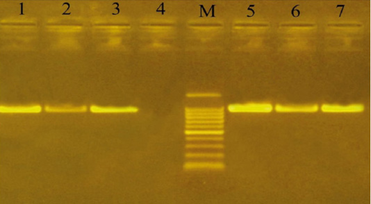 Uniplex PCR for detection of cap-A (hyaD-hyaC gene) in P. multocida isolates at amplicon size 1044 bp. Lane M: Molecular weight marker, 100-1500 bp. Lanes 1-3 and 5-7, positive samples. Lane 4: negative sample.