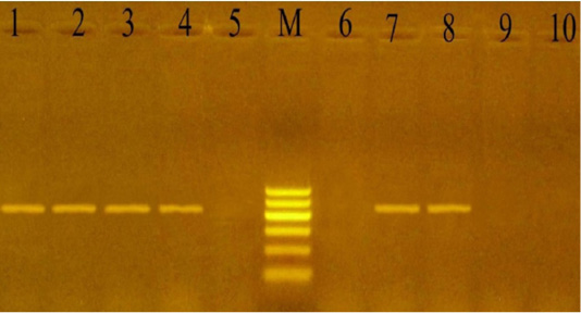 PCR for detection of Kmt1 gene in P. multocida isolates at amplicon size 460 bp. Lane M: Molecular weight marker, 100-600 bp (100bp plus DNA ladder, Vivantis, Malaysia). Lanes 1-4 and 7-8: positive samples. Lanes 5, 6 and 9-10: negative samples.