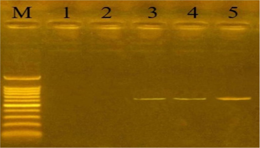 Uniplex PCR for detection of cap-D (dcbF gene) in P. multocida isolates at amplicon size 657 bp. Lane M: Molecular weight marker, 100-1500 bp. Lanes 1-2: negative samples. Lanes 3-5: positive samples.