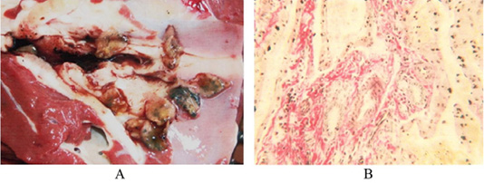 (A) Liver of the third cattle group. Bile ducts with thickened walls and live fascioles, Original. (B) Liver of the third cattle group. An enlarged stroma with dilated capillaries filled with blood. Van Gieson. Image scale 400:1