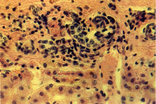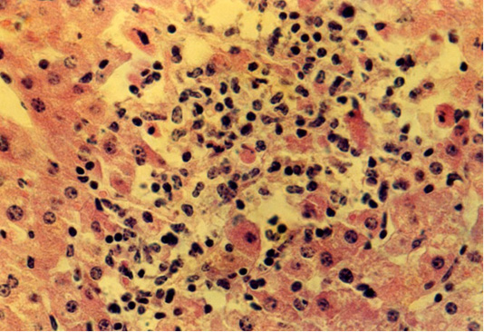 Liver of the third animals group. The lymphoid cells around the triads of the liver. Hematoxylin and eosin. Image scale 400:1.