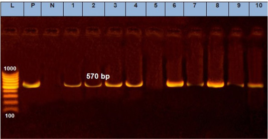 Electrophoresis of the amplified product of PCR (570bp). L: 100 bp DNA marker, p: positive control, N: negative control, from 1 to 10 samples.