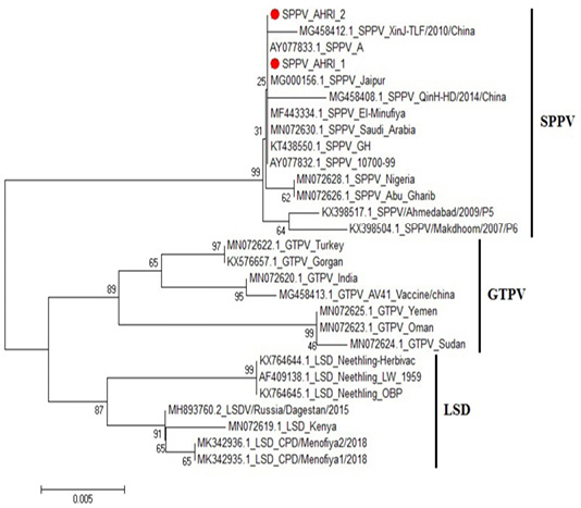 Phylogenetic tree for ORF103 partial nucleotide sequence of sheep poxvirus strain (SPPV_AHRI_1) and (SPPV_AHRI_2) (Acc. No MT210507 and MT210508) (Red circle) compared with other reference strains in GenBank database. The scale bar represents the number of substitutions per nucleotide.