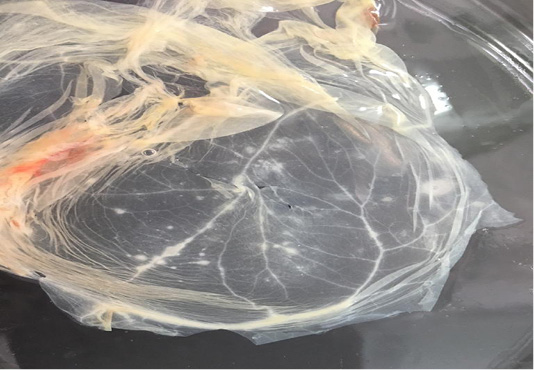 Characteristic pock lesions on CAM of SPF-ECE after three blind successive passages. (Multiple small, opaque and circular).