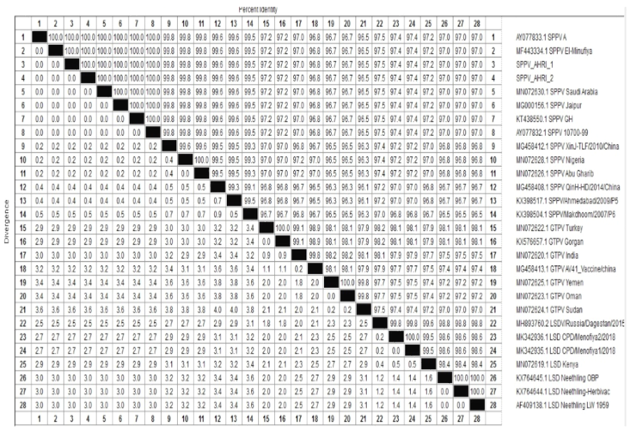 Percentage of nucleotides identity between SPPV AHRI strains and SPPV reference strains published on GenBank based on partial sequence of ORF103.