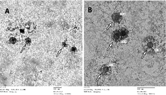 Image of Sheep poxvirus particles visualized by transmission electron microscopy where white arrow points at the virus. SPV particle size ranges from 260-320nm, image A: magnification at X20.000 – B: magnification at X40.000