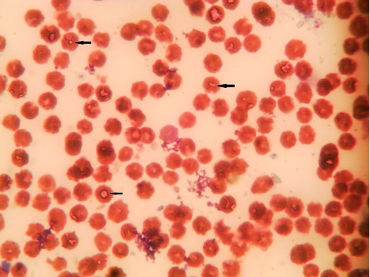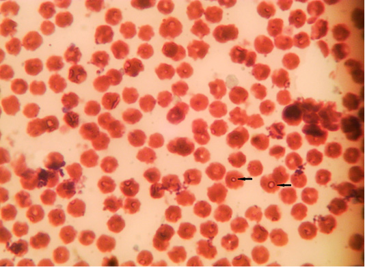 Microphotograph showing intra-erythrocytic merozoits of sheep blood smears (Field stain, x100).