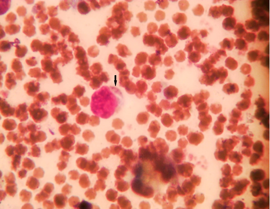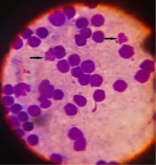Microphotograph showing lymphocytic macroschizonts (Koch’s blue bodies) of lymph nodes smears (Field stain, x100).