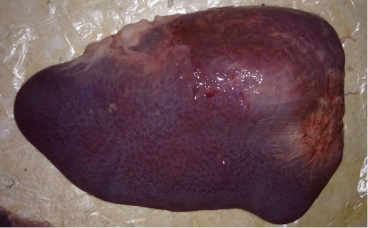 Macrophotograph of spleen showing splenomegaly and sub-capsular hemorrhages.