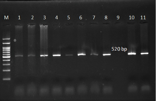 Ethidium bromide stained gel electrophoresis showing specific bands from PCR amplified products by using T. ovis specific primer in lane 1, 2, 3, 4, 5, 6, 7, 8, 10 and 11. Lane M: marker 100 bp.