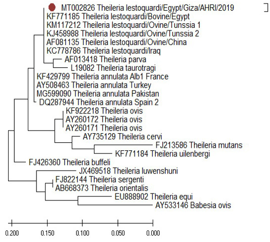 Phylogenetic tree of T. lestoquardi (MT002826) revealed 100% homology with T. lestoquardi from (KF771185), (KM117212 and KJ458988), (AF081135) and (KC778786). This isolate showed 99% homology with T. annulata from (KF429799), (AY508463), (MG599090) and (DQ287944).