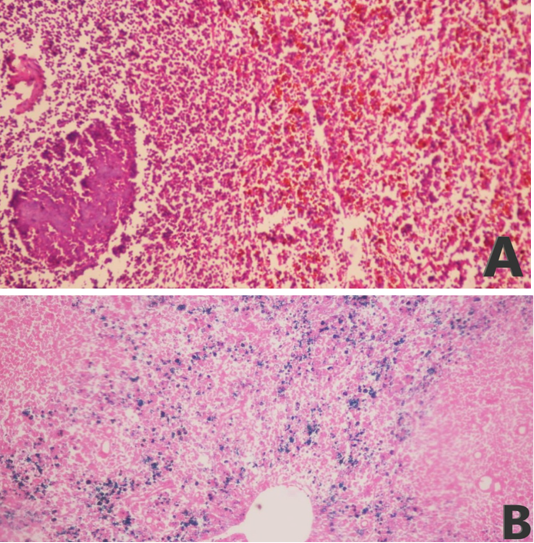 Microphotograph of sheep spleen showing (A) diffuse hemorrhage with deposition of brownish hemosiderin pigment in addition to necrotic foci and diffuse depletion of the lymphoid tissue (H and E, x200) and (B) diffuse deposition of bluish hemosiderin pigment (Prussian blue, x200).
